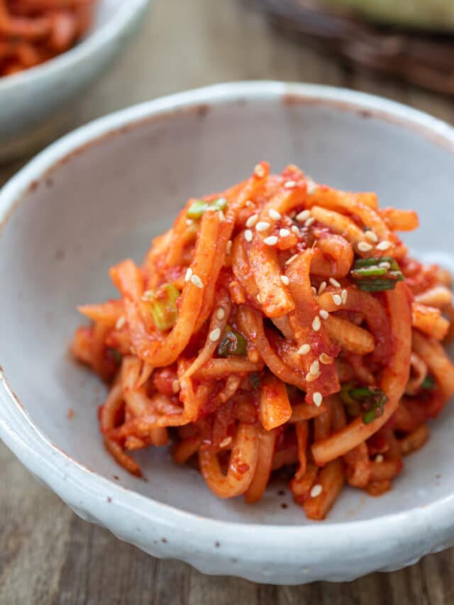 Sprinkle the salt over the radish and toss well to coat evenly. Let sit for about 20 minutes until the radish has softened and released some liquid. Drain excess liquid. Do not rinse.